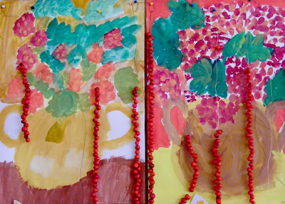 Jeřabiny ve váze od devítiletých dětí. Ukazuju jim, jak na to, jak míchat barvy a pak jen s úžasem sleduju, jak si každý pro sebe objevuje svůj vlastní postup, "své" barvy, nikdo od nikoho "neopisuje", takže co kytice, to originál. Barvy na rukou, na tváři, na podlaze, ale výsledek stojí za to.